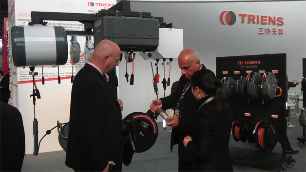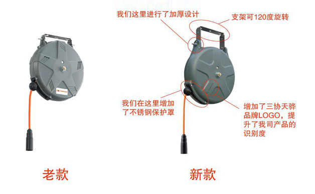 本次展會,三協(xié)天驊帶來了全新產(chǎn)品,我們對小型繞線器進(jìn)行了革命性的設(shè)計(jì)與升級,在結(jié)構(gòu)上做了很大的改進(jìn),推出了新一代系列產(chǎn)品。首先,我們對支架處重新進(jìn)行了設(shè)計(jì),不僅使繞線器可以120度旋轉(zhuǎn),而且增加了外殼與支架接觸處的厚度,使其不容易斷裂;其次,在擋球與外殼接觸處增加了不銹鋼保護(hù)罩,使其不容易被磨損;再次,我們在產(chǎn)品的外觀上增加了三協(xié)天驊品牌LOGO,提升了我司產(chǎn)品的識別度。